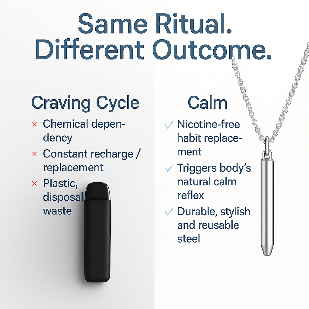 Each slow exhale through the necklace’s precision airflow core gently “tricks” your brain into believing nothing’s missing. Over time, this helps rewire your habit loop, easing withdrawal and reducing cravings naturally.
